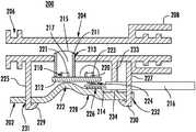 In some embodiments, thebase plate102 may comprise apush structure222 to push on thesubstrate212 to hold thegel ring211 into thehousing204. In some embodiments, thesubstrate212 may further comprise one ormore wedge terminals224 that have been SMT mounted to thesecond surface212bof thesubstrate212. In some embodiments, thebase plate202 may further comprise one or more cable wire guides configured to support (e.g., hold in place) the one or more electrical cables that engage the one ormore wedge terminals224. The wedge terminals224 (e.g., four wedge terminals) may be configured to act as springs to engage the electrical cables214 (e.g., four electrical wires), which may also be pushed on and retained in place by thepush structures226 and thepush structure228.