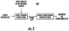 FIG. 3 shows a functional block diagram300 illustrating a method of operation of an example disposable blood pressure monitoring device (e.g., example disposable bloodpressure monitoring device100, example disposable blood pressure monitoring device200) in accordance with some example embodiments described herein. The example disposable blood pressure monitoring device may be connected to an external circuitry (not shown) through the electrical contact pads. The force sensing device (e.g.,force sensing device110, force sensing device210) and the optional signal conditioning circuitry (e.g., optional signal conditioning circuitry220) may be connected via wire bonds and a substrate (e.g.,substrate112,212). In operation, an external power source may supply a power voltage to the force sensing device via the electrical contact pads. The actuator (e.g., gel217) may exert a force against the force sensing device in response to receiving the force from an external source. The actuator may transfer the force to the force sensing device causing deflection in an electrical resistance of the force sensing device. The deflection in the electrical resistance may cause a change in an output signal of the force sensing device. This change in the output signal is an indication or measurement of the force applied by the external source. The optional signal conditioning circuitry may receive the change in the output signal and condition the received output signal.