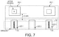 FIG. 7 shows a plan view of an exemplary embodiment of an optical arrangement. In this embodiment, the optical arrangement include three light emitting diodes and two photodetectors. The active area (A) of the photodetectors (PD) is 1.5 mm×1.5 mm. The optics are arranged such that center lines of LED's 1 and 3 correspond to the center lines of PD1 and PD2. The 3 LED's and two photodetectors are disposed within an area no larger than about 1 square cm, preferably no larger than about 0.7 square cm, specifically 1 cm×0.7 cm.