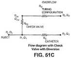 An alternative embodiment of diverting flow can be seen inFIG. 51C.FIG. 51C illustrates a flow pattern wherein the initial flow of QIis directly injected to the catheter system, and upon reaching a minimum pressure (e.g., a pressure PIand associated flow rate QI), a “check valve” may be employed to start diverting the fluid away from the catheter system. In this case, the check valve resistance (RCV) is in addition to, and prior, to the arrangement illustrated in the overflow tubing resistance (RO). InFIG. 51C, the fluid pressure and flow rate exiting the check valve are represented as PCVand QCV. One advantage of this configuration (versus the arrangement illustrated inFIG. 51B) is that this configuration may allow less fluid to be discharged, since it diverts at a higher pressure point.FIG. 30 shows an exemplary device capable of producing the fluid flows as described.