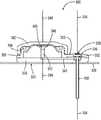 FIGS. 13E & 13F are section views of a pop-upindicator port600 with adeformable membrane622 installed as the introducer port. Referring toFIG. 13E, the pop-upindicator port600 is in the normal state with normal pressure in theintroducer channel632, with themembrane622 extending across theintroducer channel632. Referring toFIG. 13F, the pop-upindicator port600 is in the alarm state due to pressure in theintroducer channel632 exceeding a predetermined value. The pressure occurs when a therapeutic agent is being injected into the injection port, which is in fluid communication with theintroducer channel632, while the delivery tube is blocked. In the alarm state, the material of themembrane622 deforms under pressure to extend from thebody610. In another embodiment, the material of themembrane622 can deforms sufficiently to allow the therapeutic agent to leak through themembrane622, providing additional indication of the high pressure and delivery tube blockage.