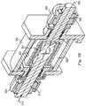 FIGS. 1-A through1-J depict the mechanics of a conventional progressing cavity power section, as is well known in the prior art. Such progressing cavity power sections are also well known as “Moineau” devices.FIGS. 1-A through1-J depict the operation of such aconventional power section100 in a series of freeze-frame cutaway section views of the power section in operation. The series of freeze-frame views depicted inFIGS. 1-A through1-J are in sequence. Parts and other features ofconventional power section100 are identified by reference number or letter, as described in detail further below. Where the same reference number or letter is used inFIGS. 1-B through1-J, the same part or feature ofpower section100 is being identified on that Figure as depicted onFIG. 1-A. In this way, reference numbers and letters onFIGS. 1-B through1-J can be omitted for clarity on some views while still allowing the reader to understand the subject matter depicted onFIGS. 1-B through1-J.