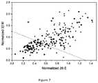 FIGS. 7 and 8 show the two-dimensional plots of the combination of two different sensing features as representative examples. The dashed line represents the cut-off between the clusters of TB positive and control samples. The 2D clusters are well separated with little overlap between them. Table 5 lists the corresponding classification success. The values for the sensitivities, specificities and accuracies of the blind experiments were typically above 90%. Finally, the ability of an array of sensors of the present invention to identify TB patients was assessed using a combination of twelve sensing features from three different sensors. Principal component analysis of the combined signals showed that the cluster of TB samples is well separated from the cluster of control samples (FIG. 9). In particular, the clusters are well-separated by a dividing plane, whereby PC1, PC2 and PC3 cumulatively contain 93% of the data variance. Principle Component Analysis (PCA) yielded excellent classification success that was comparable to the typical classification success of the two sensor combinations (see Table 5).