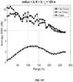 FIG. 11E andFIG. 11F are graphs that illustrates example improvement in signal to noise as a function of range due to digital compensation for frequency broadening at two different choices for the number of Doppler peaks used, according to various implementations. In each plot the horizontal axis indicates range in meters; and, the vertical axis indicates average signal to noise ratio in dB. These figures show the results of applying the speckle compensation to simulated speckle broadened data vs. range for a given choice of compensation radius r, and different numbers K of frequency points for which to compensate. Each trace indicates the SNR as a simulated target is moved from 0 to 275 meters. The trace with closed circles indicates the results with no compensation for coherence broadening. The trace marked with closed squares indicates the results with the compensation for coherence broadening tuned for a Lrcorresponding to a 125 m range to target. The trace with closed triangles indicates the gain using the compensation. At the reference distance Lr=125 m the gain is the greatest, about 2 dB. Inside of 50 meters there is a loss and beyond 200 meters there is no gain. ComparingFIG. 11E with K=3 andFIG. 11F with K=5, these figures show that the max gain of the speckle processing algorithm increases with the number, K, of Doppler frequency compensations. However, the increased gain also means increased loss when the actual range peak is far away from the reference range Lrassumed in the compensation.