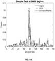 In general, to compensate for the Doppler broadening, the first step is to correctly identify the Doppler peak in the power spectrum from the shot noise background. In a preferred implementation a Finite Impulse Response (FIR) filter, G, is used to smooth the Doppler spectrum producing the dashed trace in each plot. This smoothing helps to integrate the energy over the speckle broadened peak to bring it above the fluctuations in the shot noise background. In a preferred implementation this filter is defined by a radius, r, which sets the number of taps in the filter to be 2r+1 and filter itself as the 1/e half-width of a Gaussian shape as √2 r. After the filter is applied, the Doppler peak is evident as the bin n with the largest power in the dashed trace, provided it is in the Doppler region of interest that exceeds a threshold power level, e.g., the average background noise. Then the K largest points, at bins designated nk, in the original signal (the solid trace) within radius, r, around bin n are chosen for Doppler compensation.