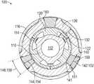 In at least one embodiment, one or more seals (one is shown:160) may be positioned between thecollar130 and eachinsert150. As shown, a recess may be formed in the (circumferential) sides141 of thecollar130 that define thewindows140, and theseal160 may be positioned at least partially in the recess. The recess and theseal160 may be positioned closer to the outer radial surface of theinsert150 than the inner radial surface of theinsert150. Theseals160 may be made from an elastomer (e.g., rubber). In at least one embodiment, theseals160 may be O-rings.