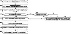One nuance of the flow ofFIG. 14A is that thecustom email handler116 must be able to distinguish the customer(s) for which it has already processed the message from the customer(s) for which it has not yet processed the message. Otherwise, upon receiving the message from MTA1102, it may incorrectly determine the email message has already been processed and thus not perform the custom processing requested by Y.com. Furthermore, thecustom email handler116 must be able to distinguish between valid email messages sent by its customers and “spoofed” email messages. In the example implementation ofFIG. 14B, this is achieved through header fields added by the MTAs and the custom email handler. As shown bymessages1404 and1410 inFIG. 14B, when sending a message to thecustom email handler116, each MTA adds a header comprising its customerID and a security key. The customerID may, for example, be a unique string of characters fixed for each customer and the security key may, for example, be a unique string of characters that can be changed occasionally/periodically/etc. As shown bymessages1406,1408, and1412, once thecustom email handler116 completes custom processing of a message for a particular client, it adds a header field indicating as much.