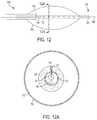 Referring toFIGS. 12 and 12A, the distal end ofcatheter1200 of the present disclosure can include one or more layers of emitters arranged circumferentially around or adjacent to aninner lumen110, as well as a support structure for use as a substrate for the application of light absorbing material. For example,FIG. 12A is a cross-sectional view along the plane demarcated by line A-A inFIG. 12, and the light absorbingmaterial support structure174 is shown exiting theinner lumen110 throughport172. The light absorbing material can be applied as a coating, as described above, on the distal end of thesupport structure174 exposed to the inner cavity of theballoon150, and the distalend support structure174 can be positioned such that it generally intersects with the path of the light emitted from the distal end of theemitters115, thereby generating a reaction between the light and the absorbing material. Theballoon150 can be inflated with an inert gas or liquid, as described above, through one or more inflation medium ports. Additionally, the distal end of the light absorbingmaterial support structure174 can be extended to intersect generally with the path of light emitted from any of the emitters that are depicted inFIGS. 3A-3C. The distal end of the light absorbingmaterial support structure174 can also exit anyports172 located along the inner lumen, as shown inFIG. 12.