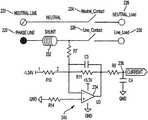 InFIG. 2, an example of the current sensor is illustrated. In some instances, the current sensor may have ashunt232 electrically connected to any of the lines in the power circuit. For example, shunt232 may be electrically connected between thephase line222 and aline contact226 for a load, where the shunt may generate an input voltage233 based on the current flow through the phase line. The current sensor may also have anamplifier240 electrically connected to the shunt and configured to amplify the input voltage233 to generate anoutput voltage236. In this case, theoutput voltage236 is the first output signal described above. Theamplifier240 may be an operational amplifier (op-amp)234 having a differential input and a single output.