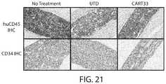 Since CD33 is known to be expressed on myeloid progenitor, albeit to lower levels compared to leukemic cells, the impact of CART33 on normal hematopoiesis was investigated. Two different models were used to assess hematopoietic toxicity of CART33. Humanized immune system (HIS) mice postnatally engrafted with human fetal CD34+ cells were bled to confirm engraftment and then were treated with CART33, CART123 or untransduced T cells (FIG. 17). Mice were bled weekly for 4 weeks. Mice were then euthanized and bone marrow and spleen from these mice were collected for analysis. As expected based on CD33 expression on myeloid lineage, these mice developed reduction in peripheral blood myeloid cells including monocytes compared to mice treated with untransduced T cells (FIG. 22). Analysis of thebone marrow 4 weeks after treatment showed reduction of the CD34+CD38-hematopoietic stem cell and the CD34+CD38+ myeloid progentiors by flow cytometry (FIG. 20) or immunohistochemistry (FIG. 21). The HIS model is biased toward B-cell lineage and so a second model that is more myeloid biased was employed. Here, bone marrow from normal adult donors was T cell depleted and injected into busulfan-conditioned NSG-S mice. Autologous CART33, CART123, or UTD were generated by transducing peripheral blood T cells from the marrow donor with the relevant lentivirus. After confirming engraftment of these mice, they were treated with autologous CART33, CART123, or UTD and followed with weekly retro-orbital bleedings for a total of 4 weeks (FIG. 22). Mice were then euthanized and tissues were harvested and analyzed. Similar to the HIS xenografts, we observed reduction in peripheral blood myeloid cells and monocytes and in the CD34+ marrow compartments.