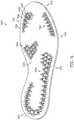 In an exemplary embodiment, protrudingmember assembly150 extends through a majority ofsole member120, with some gaps in coverage. For example, as best seen inFIG. 6, protrudingmember assembly150 includes aheel portion191 and aforefoot portion193.Heel portion191 andforefoot portion193 are connected by a lateralarch portion192, and spaced apart on a medial side ofsole member120. Further,forefoot portion193 includes arear forefoot portion194, amedial forefoot portion195 and alateral forefoot portion196. Afirst gap197 separates a portion oflateral forefoot portion196 frommedial forefoot portion195. In addition, asecond gap198 separates a portion oflateral forefoot portion196 fromrear forefoot portion194. This particular arrangement may be used to achieve tactile sensation in both the forefoot and heel. Additionally, gaps between adjacent portions of protruding member assembly150 (such asgap197 betweenmedial forefoot portion195 and lateral forefoot portion196) may help a user to better distinguish between tactile stimulation in different parts of the foot.