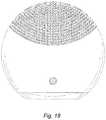 FIGS. 17 and 18 are views of one embodiment of a brush surface configuration for a skin cleanser. This brush surface configuration corresponds to the internal configuration shown inFIG. 1. The brush on the front side, as shown inFIG. 17, includes a series of thinner touch-points for gentle cleansing of non-oily or sensitive skin, with an area of thicker touch-points grouped towards the top of the cleanser. The brush on the back side, as shown inFIG. 18, provides a series of thicker touch-points allowing a deeper clean provided by the thicker touch-points to be applied to a larger area.