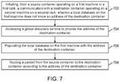 FIG. 7 illustrates another method aspect of this disclosure. An example method includes initiating, from a source container operating on a first machine in a first rack, a communication with a destination container operating on a second machine on a second rack, wherein a local database on the first machine does not know an address of the destination container (702). The method includes accessing a global discovery service to provide the address of the destination container (704), populating the local database on the first machine with the address of the destination container (706) and routing a packet from the source container to the destination container according to the address of the destination container (708). After populating the local database on the first machine with the address of the destination container, the method can include initiating, from a second source container operating on the first machine in the first rack, a second communication with the destination container operating on the second machine on the second rack, accessing the local database on the first machine for the address of the destination container and routing a second packet from the second source container to the destination container utilizing the address of the destination container obtained from the local database and without accessing the global discovery service.