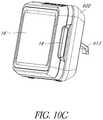 FIG. 10B is a back isometric view of the charging device of600. As illustrated, aback surface602 of thecharging device600 can include a stand orleg613 andfeet615. The leg can be configured to prop thecharging device600 up, if desired. As illustrated, for some embodiments, arecess614 is formed in the back surface such that theleg613 can be folded down into therecess614. Theback surface602 also includes a chargingport612. The chargingport612 is configured to receive a cable, which can be connected to a power source. The chargingport612 may be positioned within arecess611 that is configured to receive the cable.