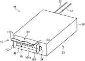 Theoptical component28 has acasing30 having substantially a rectangular parallelepiped external shape, for example. An optical semiconductor device (not depicted) such as a semiconductor laser, a photodiode, or the like is accommodated inside thecasing30, for example.Optical fibers32 are connected to theoptical component28. Theoptical fibers32 are provided to output an optical signal output from the optical semiconductor device inside thecasing30 and input an optical signal to be input to the optical semiconductor device inside thecasing30.