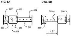 FIGS. 6A and 6B are exemplary diagrams showing top views of a Pilates apparatus with an instructional feedback system. More specifically,FIG. 6A shows a top view of a Pilates apparatus comprising amonorail600, although a pair of parallel rails as previously described may be used. Further, the drawing shows aslidable carriage203 and astationary exercise platform204 at a first end.Footprints601 represent the approximate foot positions of an exerciser not shown readying to perform a “lunge” exercise.
