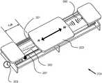 FIG. 2A is an exemplary diagram showing a top three-quarters view of aPilates apparatus200. More specifically, the primary operable components of a typical Pilates apparatus are shown, including a pair ofparallel rails201 extending substantially the length of a rectangular Pilates structure, the rails being aligned with the longitudinal axis of the apparatus, and affixed to a structure supported bysupport feet202. Astationary exercise platform204 is shown at a first end of the apparatus, and a secondstationary exercise platform206 is shown at a distal second end of the apparatus. Therebetween, aslidable carriage203 is shown slidable upon the parallel rails, and biased toward the first end by means of one or more removable attachable spring biasing means205. The spring biasing means provide a resistance force against which an exerciser must overcome in order to move the slidable carriage in a direction towards the second end of the apparatus. U.S. Pat. No. 7,803,095 titled Exercise Machine to Lagree and U.S. Pat. No. 8,641,585 titled Exercise Machine to Lagree are hereby incorporated by reference herein in their entirety.