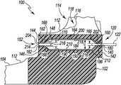 Thelower wall150 is also covered by a metallic layer orcoating210. In the illustrative embodiment, the configuration of thecoating210 substantially mirrors the configuration of thecoating200. Like thecoating200, themetallic coating210 defines a substantiallyplanar surface212 adjacent to theopening140 of thecutting block100. The coating also defines a substantiallyplanar surface214 that is adjacent to theopening144 of thecutting block100. In the illustrative embodiment, thecoating210 has substantially the same thickness along the entire lower wall158. It should be appreciated that in other embodiments the thickness may vary, particularly in thecentral section184. For example, in some embodiments, thecentral section184 may be substantially devoid of any metallic material.