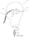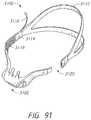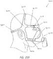 FIGS. 242A-B illustrate a headgear configuration10100 having a single back strap10120 (i.e., without a crown strap). Theback strap10120 may include arear portion10122 and afrontal portion10124. When donned by the user, thefrontal portion10124 of the singlerear strap10120 is positioned across the user's cheeks just below the eyes and rearward towards the user's ears. As illustrated inFIG. 242A, thefrontal portion10124 is connected with therear portion10122 above and slightly forward of the user's ear. The rear portion122 extends above the user's ears before extending downward towards the lower rear portion (i.e., occipital bone) of user's head. The rear andfrontal portions10122,10124 may have different constructions. In other words, therear portion10122 may be more rigid than thefrontal portion10124. Accordingly, thefrontal portion10124 stretches to provide a retention force to the mask10102 and allows the headgear10100 to stretch such that the headgear may be donned on the user's face. The headgear configuration10100 having thesingle hack strap10120 provides a headgear arrangement that is low in cost, easily manufactured and easily fitted to a user.
