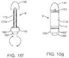 Valve155 may comprise a triangular or other shapedsection156 of a material157 which is placed within achamber158cof a valve housing158 (alternately, it may be placed directly within tubing164).Section157 is configured to mechanically degrade (e.g., tears, shears, delaminates, etc.) at a selected pressure so as to allow the passage of gas through tube164 and/orvalve chamber158c.Suitable materials157 forvalve155 can include bees wax or other form of wax and various adhesives known in the medical arts which have a selectable sealing force/burst pressure. Valve fitting158 will typically comprise a thin cylindrical compartment (made from biodegradable materials) in whichsection156 ofmaterial157 is placed (as is shown in the embodiment ofFIG. 13b) so as to seal the walls ofchamber158ctogether or otherwise obstruct passage of fluid through the chamber. The release pressure ofvalve155 can be controlled through selection of one or more of the size and shape ofsection156 as well as the selection of material157 (e.g., for properties such as adhesive strength, shear strength etc.). In use,control valve155 allows for a sequenced inflation ofballoon160 and172 such thatballoon160 is fully or otherwise substantially inflated beforeballoon172 is inflated. This, in turn, allowsballoon160 to pushballoon172 along with the rest ofdelivery mechanism170 out of capsule120 (typically frombody portion120p′) beforeballoon172 inflates so that deployment oftissue penetrating members140 is not obstructed bycapsule120. In use, such an approach improves the reliability of the penetration oftissue penetrating members140 into intestinal wall IW both in terms of achieving a desired penetration depth and delivering greater numbers of the penetratingmembers140 contained incapsule120 since the advancement of the members into intestinal wall IW is not obstructed by capsule wall120w.