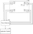 Touch detector120 is connected to the transmitters and sensors shown inFIG. 1. In some embodiments,detector120 includes one or more of the following: an integrated circuit chip, a printed circuit board, a processor, and other electrical components and connectors.Detector120 determines and sends a signal to be propagated bytransmitters104,106,108, and110.Detector120 also receives the signal detected bysensors112,114,116, and118. The received signals are processed bydetector120 to determine whether a disturbance associated with a user input has been detected at a location on a surface ofmedium102 associated with the disturbance.Detector120 is in communication withapplication system122.Application system122 uses information provided bydetector120. For example,application system122 receives from detector120 a coordinate associated with a user touch input that is used byapplication system122 to control a software application ofapplication system122. In some embodiments,application system122 includes a processor and/or memory/storage. In other embodiments,detector120 andapplication system122 are at least in part included/processed in a single processor. An example of data provided bydetector120 toapplication system122 includes one or more of the following associated with a user indication: a location coordinate of a surface ofmedium102, a gesture, simultaneous user indications (e.g., multi-touch input), a time, a status, a direction, a velocity, a force magnitude, a proximity magnitude, a pressure, a size, and other measurable or derived information.