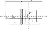In this particular example, the light-sensing region can include at least one segment of an unequal width region. Also, the width of the unequal width region away from light-transmitting region II may be greater than the width of the unequal width region close to light-transmitting region II in the direction along axis CD. That is, when the positional relationship between light-emittingelement13 and light-transmitting region I is the predetermined positional relationship, in the direction along axis CD, for the portion of the light-sensing region that extends beyond the light-transmitting region II, the width away from axis AB may be greater than the width close to axis AB.
