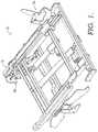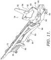 As best seen inFIG. 10, acarrier plate66 is coupled to thebase plate50. More specifically, the rearward end ofcarrier plate66 is coupled toroller64, which is held withinroller track62. The forward end ofcarrier plate66 has anelongated slot68 formed therein. Aroller70 is coupled to thehub65 inbase plate50. Theroller70 and theroller64 allow thecarrier plate66 to move relative to thebase plate50. Afront roller track72 and arear roller track74 are fixedly coupled tocarrier plate66 in an inclined orientation, as seen inFIG. 10. Afront roller76 is held withinfront roller track72, and a rear roller78 (partially shown inFIG. 10) is held withinrear roller track74. The lower side of the front ofcarrier plate66 is further supported by acylindrical post79 that is fixedly coupled tobase plate50.FIG. 10 also shows atoggle link85 that is part of theback assembly14 and that is pivotably coupled tobase plate50. Togglelink85 is prevented from over-rotation by astop81 that extends frombase plate50.