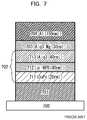 Comparative Example 1The conventional light-emitting element provided with anelectron injecting layer703 instead of the foregoing second and third layers according to the present invention is specifically explained in this comparative example 1. The configuration of the light-emitting element is explained with reference toFIG. 7. Theelectron injecting layer703 was, as is the case with thesecond layer603 in Example 1, made from an electron transporting material Alq3doped with 1 wt % of Mg that is a material having an electron donor property for the Alq3. Theelectron injecting layer703 was formed to have a thickness of 30 nm as is the case with thesecond layer603 in Example 1. Asubstrate700; ananode701; a layer containing a light-emittingmaterial702 composed of ahole injecting layer711, a hole transporting layer712, and a light-emittinglayer713; and acathode704 were formed to have the same structures as those in Example 1. Therefore, the light-emitting element according to Example 1 is thicker by the thickness of the third layer604 (150 nm) than that according to Comparative Example 1.