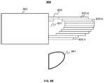 As shown inFIG. 8B, ashield component860 may shield a first portion of theleaves820 and form anaperture831. The first portion of theleaves820 may be actuated to move and the second portion of the leaves510 (e.g., the other leaves excluding the first portion) may be held still when the radiation delivery is on; the second portion of theleaves820 are at their respective positions to allow passage of the radiation beams, and the first portion of theleaves820 are shielded by theshield component860. The modified beam shape may correspond (or approximately correspond) to a desiredtreatment region841 and be delivered toward the desiredtreatment region841. In some embodiments, as shown inFIG. 8C, theshield component860 may switch from a first shielding position where it shields the first portion of theleaves820 to a second shielding position where it shields the second portion of theleaves820, and anaperture832 may be formed. The modified beam shape may correspond (or approximately correspond) to a desired treatment region842 (see the solid lines inFIG. 8C) and be delivered toward the desiredtreatment region842. The dashed lines illustrates an edge of the treatment region formed before the first portion of theleaves820 are moved. Using theshield component860, at least a portion of theleaves820 may be moved to next position(s) when the radiation delivery is on, and accordingly, the translation speed of theMLC800 may be improved, and the duty cycle can be increased. In some embodiments, theshield component860 may be configured as a sheet or plate. In some embodiments, theshield component860 may be made of a substantially-radiation-impermeable material that can block radiation. In some embodiments, theshield component860 may be positioned in a plane perpendicular to the depth of theleaves820. In some embodiments, theshield component860 may have a shape of a rectangle, square, ellipse, round, polygon, or the like, or any arbitrary shape.