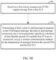 FIGS. 5A and 5B are flow diagrams of processes to exchange messages according to an embodiment.Block502 may comprise transmitting an FTM request message (e.g., initial FTM request message304) from an initiating STA, which may be received atblock506 at a responding STA. The FTM request message transmitted atblock502 may comprise one or more fields specifying, among other things, a request for one or more bursts of FTM messages to be transmitted by a responding STA. In response to receipt of an FTM request message atblock506, a responding STA atblock508 may transmit at least a clear to send message. The clear to send message may comprise one or more parameters specifying a duration of time that the responding STA and an initiating STA are to exclusively occupy a wireless communication medium for the transmission of messages between the initiating STA and responding STA. The messages transmitted between the initiating STA and the responding STA may comprise FTM messages transmitted from the responding STA in a burst of FTM messages and transmission of acknowledgement messages in response to the FTM messages. This duration (during which the initiating STA and responding STA are to exclusively occupy a wireless communication medium) may be based, at least in part, on parameters specified in the FTM request message transmitted atblock504 and determined based, at least in part, according to expression (1). The clear to send message transmitted atblock508 may be received atblock504.