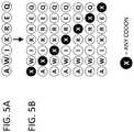 FIGS. 9A-9B depict a reference amino acid sequence (FIG. 9A) and a library of amino acid sequence variants (FIG. 9B), each variant comprising a stretch of amino acids (indicated by patterned circles), each stretch having a single site of multiple position variants differing in sequence from the reference amino acid sequence. In this illustration, 5 positions are varied where the first position has a 50/50 K/R ratio; the second position has a 50/25/25 V/L/S ratio, the third position has a 50/25/25 Y/R/D ratio, the fourth position has an equal ratio for all amino acids, and the fifth position has a 75/25 ratio for G/P. The reference amino acid sequence and variant sequences are encoded by nucleic acids and variants thereof generated by processes described herein.