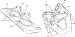 A third connection feature infirst mount101 is the pair of thirdmechanical coupling elements104, for example illustrated as C-shaped or arc-shaped hooks or clamps. These thirdmechanical coupling elements104 may be configured for example to fit over and latch to corresponding shoulder features on a second mount to provide an additional mechanical coupling. This mechanical coupling may for example resist motion in a direction perpendicular to the plane of the back face offirst mount101, while theX-shaped indentation103 may resist motion along this plane. In the embodiment shown inFIG. 1, the thirdmechanical coupling elements104 are connected to thefirst mount101 with hinges that allow them to rotate flat against the back of thefirst mount101, or to rotate and extend perpendicular to the back of thefirst mount101 as shown inFIG. 1. The back offirst mount101 may contain indentations into which the thirdmechanical coupling elements104 fit when rotated toward thefirst mount101, so that the back of thefirst mount101 is flat when the thirdmechanical coupling elements104 are not rotated away from thefirst mount101. The thirdmechanical coupling elements104 may also persist in their rotated out position, to function as a stand for thefirst mount101.