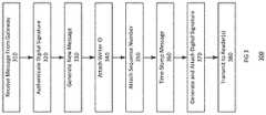Instep370, thewriter130 may generate a unique digital signature for the message and attach the digital signature to the message. The digital signature for the writer may be based on one or more of the following: message content (including the incoming message body from the application and/or gateway signature on incoming message), writer ID, sequence number, and time stamp. The digital signature may be unique for each message and may be used by recipients of the outgoing message to verify the authenticity of the outgoing message.