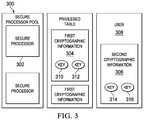 FIG. 3 depicts a key management scheme according of this disclosure wherein each secure processor in a processor pool has an associated key-pair that is unique to the secure processor;