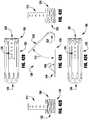 Referring now toFIG. 82, anactuation mechanism3400 for use in implantable prosthetic devices, such asdevices100,200,300 described above, is shown. Themechanism3400 includes first andsecond control members3410,3420 that extend from adelivery device3402. Thedelivery device3402 may be any suitable device, such as a sheath or catheter. The first andsecond control members3410,3420 include first andsecond sutures3412,3422 and first and secondflexible wires3414,3424. The first and secondflexible wires3414,3424 extend from thedelivery device3402 and each include aloop3416,3426 for receiving the first andsecond sutures3412,3422 and for engaging a clasp (e.g.,clasp1200 described above). Each of the first andsecond sutures3412,3422 extends from thedelivery device3402, through a one of the first andsecond loops3416,3426, respectively, and back into thedelivery device3402. In some embodiments, the first andsecond control members3412,3422 extend throughseparate delivery devices3402. Thesutures3412,3422 are removably attached to moveable arms of exemplary barbed clasps described above. The first andsecond loops3416,3426 of therespective wires3414,3424 are able to move along the correspondingsutures3412,3422 such that theloops3416,3426 can engage the corresponding barbed clasps to engage the moveable arms. That is, thesutures3412,3422 are used to pull the moveable arms in an opening direction and thewires3414,3424 are used to push the moveable arms in a closing direction. Thewires3414,3424 can be made of, for example, steel alloy, nickel-titanium alloy, or any other metal or plastic material. In certain embodiments, thewires3414,3424 can have a diameter between about 0.10 mm and about 0.35 mm, between about 0.15 mm and about 0.30 mm, and between about 0.20 mm and about 0.25 mm.
