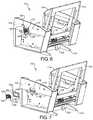 As shown inFIGS. 3-5, the mountingcradle26 may include ahousing30. Thehousing30 may be received through a cutout or opening32 (FIGS. 2 and 5) in thearmrest panel33 one of the armrest frames14 of thefurniture member10. Thehousing30 may include one or more retaining clips or resiliently flexible arms34 (FIGS. 4 and 5) that may snap into engagement with thearmrest panel33.FIGS. 1 and 5 show the mountingcradle26 fully installed into thearmrest panel33, whereby interference between a flange orescutcheon36 of the mountingcradle26 and an outer surface38 (FIG. 1) of thearmrest panel33 and interference between theflexible arms34 and an inner surface40 (FIG. 5) of thearmrest panel33 securely retain the mountingcradle26 on thearmrest frame14.