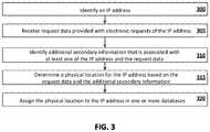 Generally, IPlocation determination engine126 determines a physical address to associate with an identified IP address. In some implementations, IPlocation determination engine126 may receive request data fromrequest data engine122 and/or secondary information fromsecondary information engine124 and determine a physical address to associate with the IP address based on the request data and/or secondary information. IPlocation determination engine126 may assign the physical address to the IP address and store the IP address and assigned physical address inIP database110. In some implementations, IPlocation determination engine126 may additionally and/or alternatively determine an email address to associate with the IP address based on the request data and/or secondary information. IPLocation determination engine126 may assign the email address to the IP address and store the association of the email address to the IP address inIP database110.
