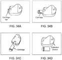 FIG. 34B illustrates the partially removed cartridge. Removal of the cartridge can be performed using the cartridge tab shown inFIG. 34A. InFIG. 34C, the cartridge depicted inFIG. 34B has been completely removed and is placed at the back of the collection device in an orientation by which it was removed.FIG. 34D illustrates the fully removed cartridge placed parallel with the collection device to illustrate the positioning of the cartridge within the device. Once removed, a cartridge can be placed in a secondary vessel with desiccant to dry the sample. In instances where the cartridge comprises strips of solid matrix for storing the sample, the strips can be removed with an extraction tool or other mechanism prior to analysis.