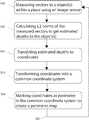 FIG. 2D illustrates all identified perimeter coordinates107 corresponding to place104 translated from depth estimates calculated from depth vectors measured byimage sensor100 to all perimeters ofplace104. Perimeter coordinates identified in each new field of view ofimage sensor100 asrobotic device101 moves aroundplace104 correspond to the current coordinate system observed byimage sensor100. Therefore, new perimeters identified in each new field of view correspond to a different coordinate system. To consolidate all perimeter coordinates into a single coordinate system, the processor transforms coordinates from each different coordinate system to a single coordinate system using a movement vector, such that all perimeter coordinates107 can correspond to a single coordinate system as shown inFIG. 2D. The processor may use other methods of transforming the coordinate system to a single coordinate system.
