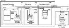 In a pathological room PR inside the hospital or a building EX outside the hospital, the pathologist as an observer uses aviewer computer500 connected to theimage management server400 via thenetwork300 to observe the JPEG image stored on the hard disk HD2 of theimage management server400.