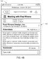 FIG. 4A is a day view in portrait mode of an integrated calendar function herein, as illustrated by theUI depiction400 at420, and a day view in landscape mode as depicted at425. The currently selected day415 (i.e., the “29th”) is shown in blue to convey that it has been selected by the user and the current day, the 28th, is shown in gold to indicate it is the current day. The event (i.e., “meeting with Paul . . . ”)410 is shown in blue to convey that the user has previously selected it to navigate to and display a specific meeting detail screen. An example of a detailed meeting screen corresponding to the selectedevent410 is shown inFIG. 4B, generally at430. As seen, thedetailed meeting screen425 includes the specific particular information regarding the selectedevent410. In this manner, a user can easily ascertain “where” they are located within the visualized representation of the integrated calendar and timeline application, and in reference to the current calendar day405 (Oct. 28, 2011) is shown in gold (similar to referenceditem315 inFIG. 3).UI420 is a representation ofUI400 as it may be displayed in a portrait orientation, whereasUI425 is a representation ofUI400 displayed in a landscape mode or a widescreen display. Meeting detailsUI435 may be presented to the user in response to the user selecting the meeting at410. The meeting details screen shown atUI435 inFIG. 4B may include specific information regarding the selectedmeeting410, including the date, time, company, attendees, etc. associated with the meeting.UIs420 and425 illustrate how a user might navigate back to an earlier date from a current location/time by scrolling (dragging or swiping with a mouse or touch gesture) the daysribbon UI element426 right towards445 (thus exposing earlier days towards the left side of the days UI element ribbon) or forward to a future date by scrolling left towards440 (thus exposing future days towards the right side of the days UI element ribbon element426). A user may scroll through days in the daysribbon UI element426 and select a new day in the scrolling days ribbon UI element. Following that selection, the corresponding meetings/appointments that are displayed withinareas427 inUI420 andUI425 inFIG. 4A will automatically scroll horizontally through all day meetings/appointments in an animation from and between the currently selected day to the newly selected day in thedirection440 or445, according to whether the newly selected day is in the past or in the future. In an example, if a newly selected date in thedays ribbon element426 is in the future of the currently displayed day (i.e., toward the right), then the meetings/appointments area427 will automatically scroll towards the left (440), thereby displaying meetings/appointments towards the right and finally stopping on the corresponding selected day in the future. Conversely, if, by example, a newly selected date in the days ribbon element is in the past of the currently displayed day (i.e., toward the left), then the meetings/appointments area427 will automatically scroll towards the right (445), thereby displaying meetings/appointments towards the left and finally stopping on the corresponding newly selected day in the past. This provides the user or other entity with a context of “traveling” forward or backwards through time (time travel experience).