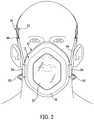 FIG. 2 is a front elevational view of therespirator mask10, shown as worn on the head of a wearer. Themask portion12 of therespirator mask10 is roughly hexagonal in overall shape, with rounded corners. As was described briefly above, thefilter cartridge16 and other components are arranged to traverse the perimeter or periphery of themask portion12, leaving the central area of themask portion12 open. As will be described below in more detail, themask portion12 of therespirator10 may assume other shapes.