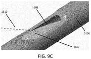 FIGS. 9C-D illustrate embodiments of the outer tubular body ofFIG. 9B comprising agap1608. The gap allows for light to reflect from the mirroredsurface1602 and be directed down thetubular body1606, thereby transmitting an image of the field of view available through the gap down the elongated body. Such an image may be transmitted along an optical hypotube and/or image guide such as described elsewhere in the specification. Further components, such as illumination elements may be used to direct light along the mirrored surface and out through the gap to illuminate surrounding tissues. In embodiments, the gap may allow for a field ofview1610 that extends forward and above the distal end of the tubular body. Depending on the angle and orientation of the mirrored surface, the magnitude of the field of view may be between about 45° and 120°, such as between about 55° and 85°. In one implementation, the angle may be approximately 70°.