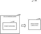 FIG. 1A shows an example apparatus comprising a platform region, force sensors, and a processing circuit, consistent with various aspects of the present disclosure;
