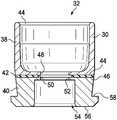 FIG. 5 depicts a side, cross-sectional view of a three piece primer insert used in a polymeric cartridge case. The threepiece primer insert32 has an upperprimer insert portion38 and a lowerprimer insert portion40 are separated by aninsert spacer42 to form an upper insert joint44 between the upperprimer insert portion38 and theinsert spacer42 and a lower insert joint46 and the lowerprimer insert portion40.