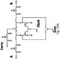 The basic element of the ALU is an ERSFQ half-adder cell (seeFIGS. 19A-19B). Here the addend bits A and B are added, together with the Carry bit. The output is triggered by the arrival of the Clock pulse, generating the Sum output at the bottom. A key feature of this cell is its asynchronous Carry signal, which is not latched to a clock signal, and is therefore produced as soon as both ‘1’ arguments arrive at the ALU. This property allows Carry signals to propagate in the form of a wave (wave-pipelining).