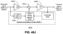 FIG. 46J is a block diagram4650 illustrating an example, non-limiting embodiment of repeater circuitry in accordance with various aspects described herein. In particular, an embodiment of impulse cancellation circuitry4646-1 is shown along with a portion of transceiver circuitry that includes low noise amplifier (LNA)4652, summingcircuit4653 and power amplifier (PA)4658.