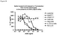 FIG. 14 shows that the IL-23p19 antibodies 5040Q/EVand 3759EQ/QSof the invention inhibit native hrIL-23 mediated IL-17 production.