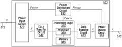 FIG. 5bshows an example embodiment wherein anetwork sanitization device502 receives power from the network connection using active PoE. Here thesecond network cable512 has z wire pairs of which all carry data. Apower input circuit522 comprises an active PoE extractor for extracting a common-mode voltage from at least one wire pair used by a seconddata transfer circuit542 to transfer data. This may be extracted by center tap. The seconddata transfer circuit542 is connected to thepower input circuit522 by data signaling albeit with the power extracted/absent. The seconddata transfer circuit542 receives data to be transferred to thesecond network cable512 and/or provides data transferred from thesecond network cable512 directly or indirectly via additional modules to the processing logic shown here which may comprise theprocessing logic375 as described in relation to any of the suitable examples provided herein.