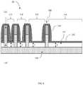 Atblock1201, form a plurality of gaps of variable size between device features, each of the gaps including vertical sidewalls perpendicular to a substrate surface and a horizontal surface parallel to the substrate surface.
